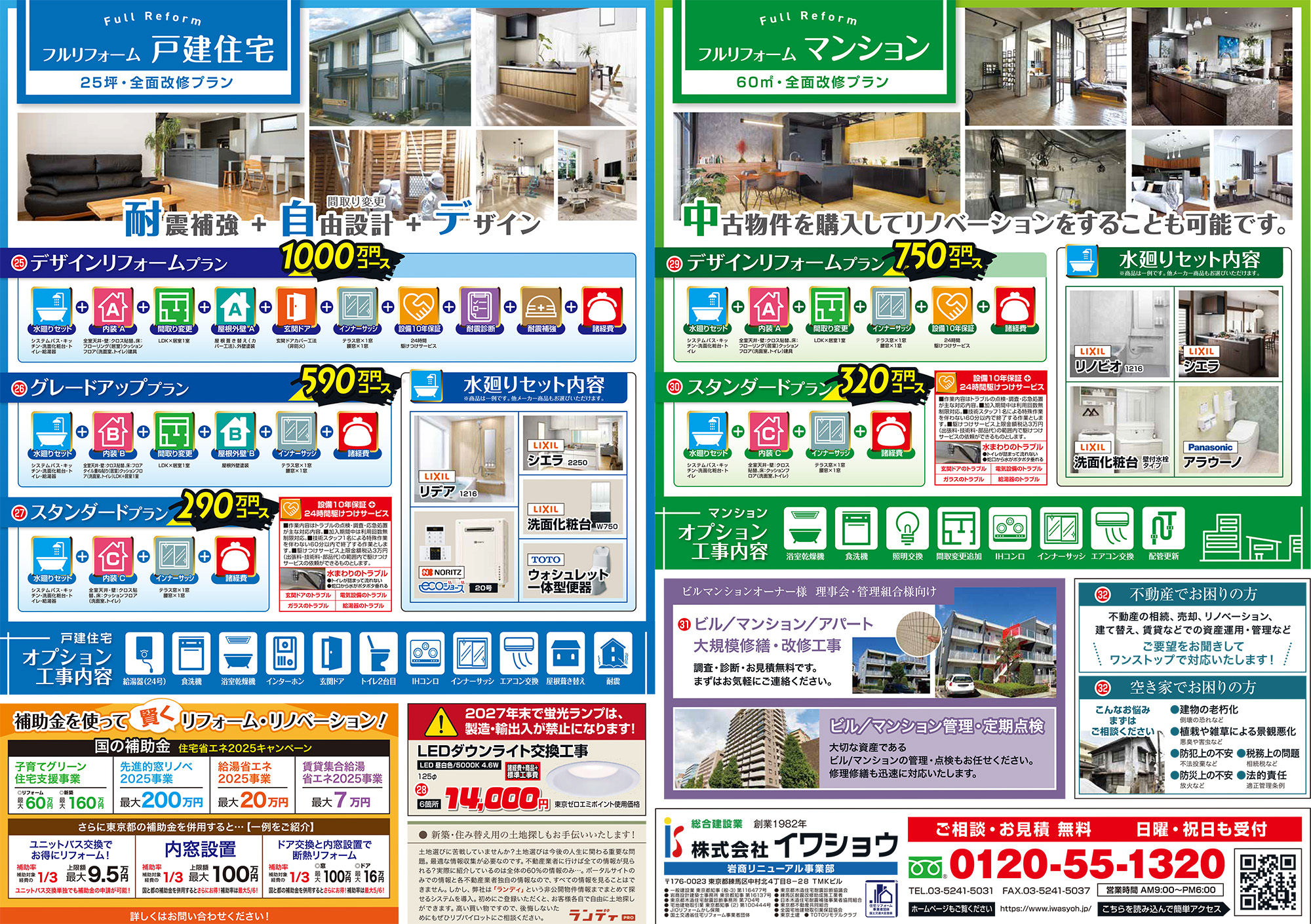 event オータムセール開催! 一言 イワショウの高い技術力で最適なリフォームを実現します! 備考 大型補助金が今年最終?!お早めにご相談下さい。 Application イベントへのお申し込みはこちらから STEP.1 必要事項の入力 STEP.2 入力内容の確認 STEP.3 お申し込み完了 STEP.1 必要事項の入力 STEP.2 入力内容の確認 STEP.3 お申し込み完了 STEP.1 必要事項の入力 STEP.2 入力内容の確認 STEP.3 お申し込み完了 必須イベント名 必須参加希望日 必須参加人数 必須お名前 必須メールアドレス 任意郵便番号 住所検索 必須住所 任意電話番号 任意お問い合わせ内容 ※当社が保有する個人情報に関して適用される個人情報保護法およびその他の法令・規範を遵守いたします。内容をご確認の上、よろしければ上記の「入力内容を確認する」ボタンを押して下さい。 ※このサイトはreCAPTCHAを利用しており、下記内容の他、Googleプライバシーポリシーおよび利用規約が適用されます。 個人情報利用目的 ・お客様のご要望に合わせたサービスを提供させていただくための各種ご連絡。・お問い合わせいただいたご質問への回答のご連絡。尚、お客様から収集する個人情報は弊社の定めるプライバシーポリシーに則って厳重に管理いたします。 プライバシーポリシー 株式会社 岩商では、イワショウホームページ(以下、「当サイト」といいます。)の運営に際し、お客様のプライバシーを尊重し個人情報に対して十分な配慮を行うと共に大切に保護し、適正な管理を行うことに努めております。 1.個人情報利用目的 お客様の個人情報は、原則として、当社のサービスに関する情報をご提供する目的や当社に対するご意見、ご要望に関する今後の改善、及び、問い合せに関するご回答のために利用致します。それ以外の目的で利用する場合は個人情報をご提供いただく際に予め目的を明示しておりますのでご確認下さい。 2.第三者への情報提供 お客様の個人情報は、以下の場合を除き第三者に開示、提供、譲渡、することは致しません。1.法的拘束力がある第三者機関からの開示要求がある場合2.協力業者と提携して業務を行う場合(協力業者にも適切な管理を行います)3.お客様本人の同意があった場合 3.開示等の請求等 お客様等が個人情報の利用目的の通知、個人情報の開示、訂正、追加若しくは削除を希望される場合は、希望される方が本人であることを確認の上速やかにこれに対応いたします。 4.安全管理 個人情報保護に関して適用される法令、規範を遵守するとともに正確かつ最新の内容に保ち安全管理のための必要かつ適切な措置を行います。 5.従業員の監督 弊社では、お客様等の個人情報の安全管理が図られるよう従業者に対する必要かつ適切な監督を致します。また、従業者に対して個人情報の適正な取り扱いの確保のために必要な教育を実施します。 6.クッキー(Cookie)の利用 当サイトではクッキー(Cookie)を利用しております。クッキー(Cookie)を使用する目的はお客様が当サイトを再訪された際に便利にお使い頂くことを目的に使用しており、お客様のプライバシーを侵害するものではありません。 7.適用範囲 本プライバシーポリシーは当サイト内にのみ適用されます。当サイトからリンクの張られている他のサイトでの個人情報保護についてはリンク先のプライバシーポリシーによって行われます。 8.漏えい発生時の対応 お客様等の個人情報の漏えい等が発生した場合には、事実関係を速やかにお客様等に通知するなど、迅速かつ適切に対応します。 9.継続的改善 弊社では、個人情報保護に関する内部規定の整備、従業者教育及び内部監査の実施などを通じて、社内における個人情報の取り扱いについて継続的な改善に努めます。 一覧へ戻る